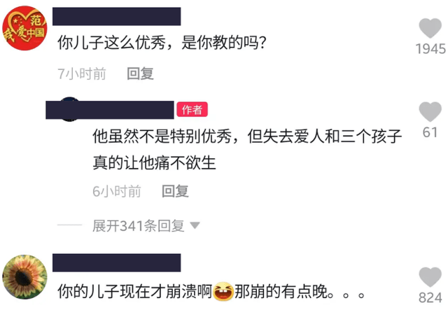 可惜这番言论并没有获得网友谅解,反而被质疑现在崩溃是不是有点晚啦?还有网友直接反讽:“你儿子这么优秀是你教的吗”,该账号却还在给林生斌找补,回复:”失去爱人和三个孩子真的让他痛不欲生“。