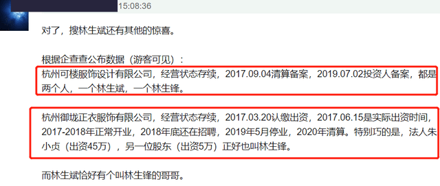 火灾发生后,林家人表现得一直比朱家人要积极,这种积极还是全方面的,一边是积极配合林生斌对外的舆论,一边是积极参与朱小贞留下的生意,公开平台就可以查询到朱小贞生前实缴45万成立的公司,里面就有林家人的份儿。
