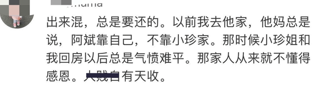朱小贞的朋友在回忆林生斌与朱小贞相处时还提到,林生斌母亲还总是说林生斌发家是靠自己,而不是靠朱小贞,每次听到朱小贞和朋友都很气愤,朱小贞朋友更是气愤地说:”那家人从来就不懂得感恩!“