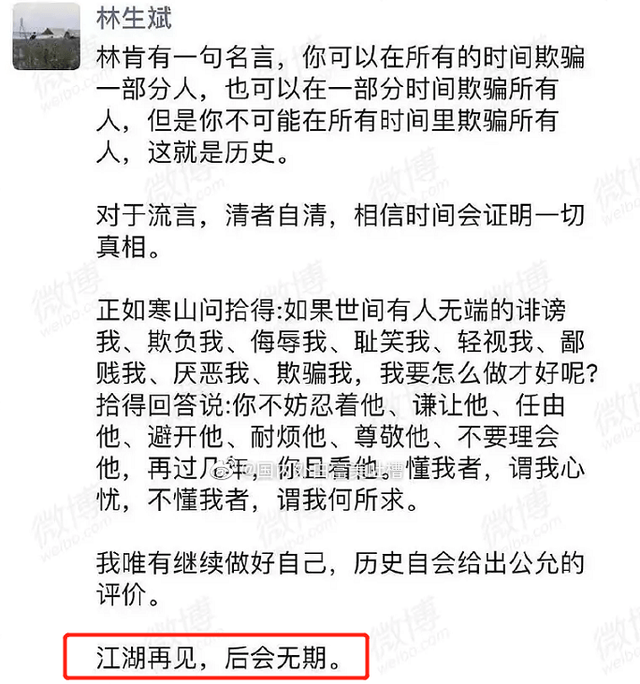儿子的回应写着”江湖再见,后会无期“,父亲的账号挂着”梦想实现,一飞冲天“,不知道林生斌一家给出所谓真相的时候,能不能好好说说这十六个字,到底是何意呢?