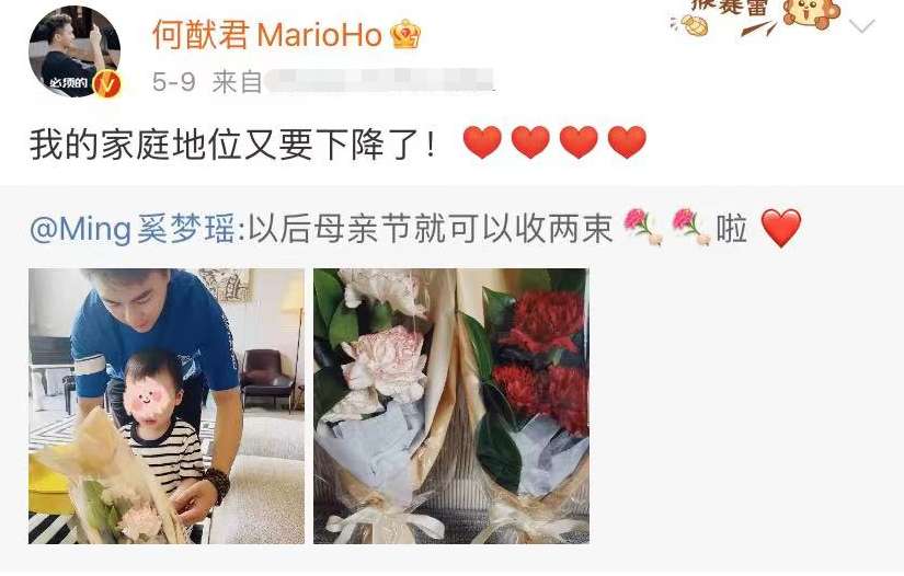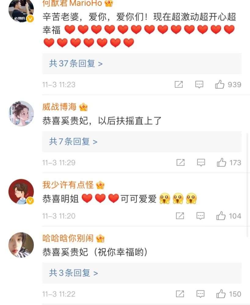在奚梦瑶发布完官宣动态后,何猷君立刻出现在她的评论区大方表白:辛苦了老婆,爱你,爱你们!现在超激动,超开心,超幸福。