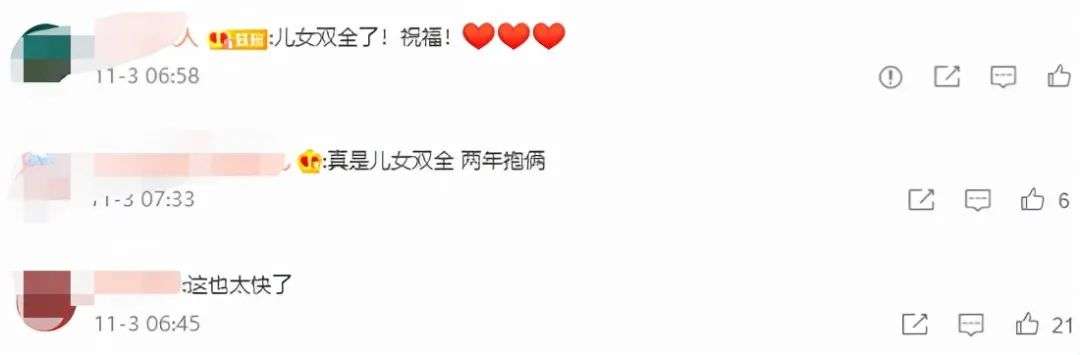 网友们表示奚梦瑶和何猷君这下是儿女双全了,还有人感慨奚梦瑶二胎生得好快,两年抱俩,肚子就没被停下来过。