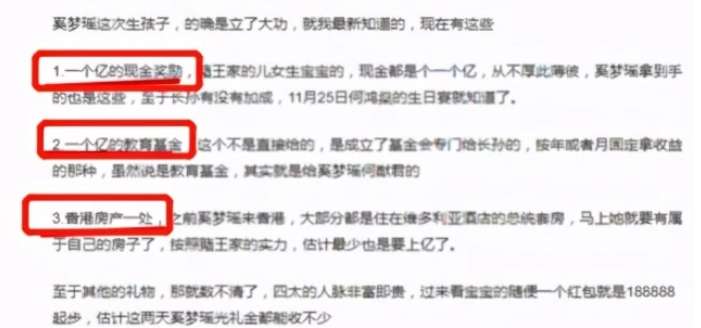 一胎得子的奚梦瑶产后获得了很多奖励,有港媒爆料称奚梦瑶不仅收获了1个亿的现金,还有1个亿的教育基金,以及香港一处价值上亿的豪宅,光这些就已经价值3亿了。
