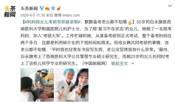 经过又一年的刻苦备考,女儿也顺利被录取,成为母亲的学妹。