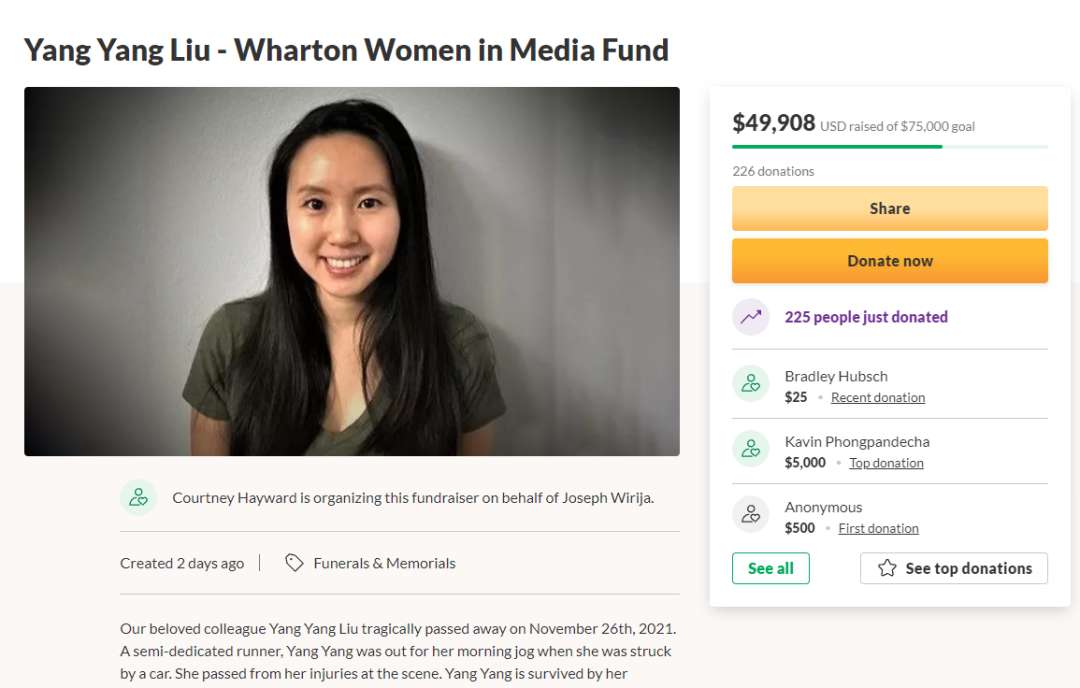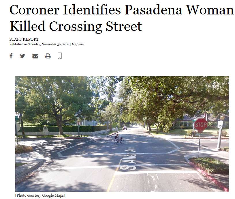 一名华裔女子刘洋洋(Yang Yang Liu,音译)于11月26日,在洛杉矶县巴沙迪那市的一条安静街道上慢跑时被撞,因头部遭重创,当场死亡,享年33岁。