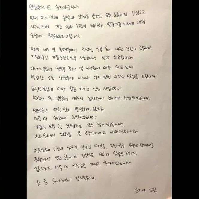 对此宋智雅迅速做出了反应,不光发表了手写道歉信,还承诺会把发表假货的帖子都删掉。