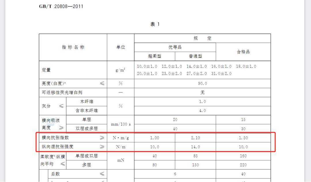 质监局发布的纸巾纸国家标准。这类纸巾在制作时的、有一项非常重要的「湿抗张强度」标准,指的是纸张在完全湿润状态下的耐撕性能,追求遇水不烂