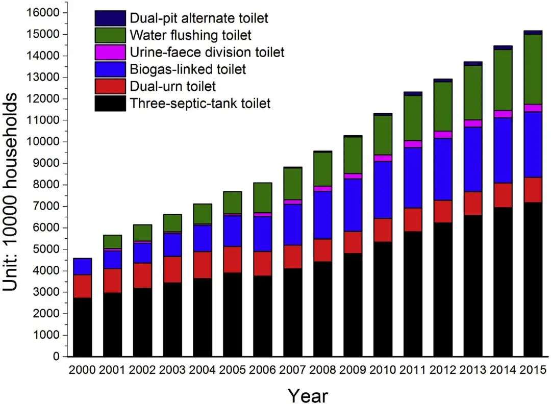2000 年-2015 年中国农村地区每年安装的六种不同无害卫生厕所的数量/《环境管理杂志》2018