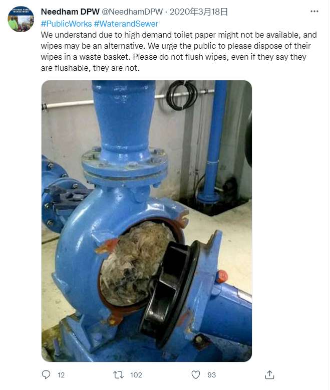 美国尼德姆公共工程部发推恳请市民将「替代厕纸」用完后包起扔入纸篓,为加强教育效果甚至还附上了一张管道堵塞的现场图