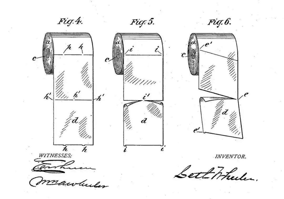 1891 年,Seth Wheeler 发明了卷筒卫生纸,甚至专门为「卫生纸的放置朝向问题」申请了专利