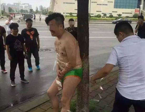 在中国某地,这位新郎出门还是西服笔挺,然后就被扒成这样了,胸前还被记号笔写上了侮辱性的词语↓↓↓