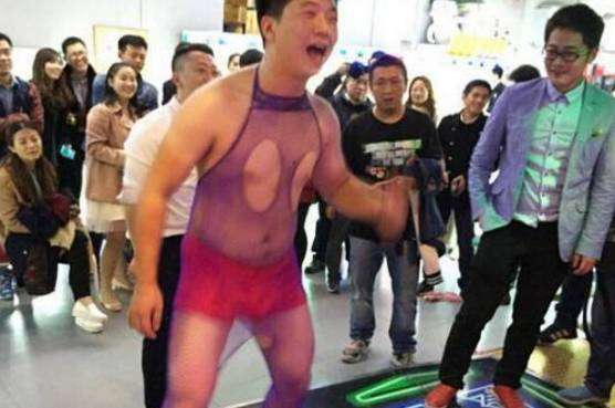 还有这位,穿成这样还要笑着玩跳舞机