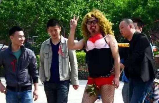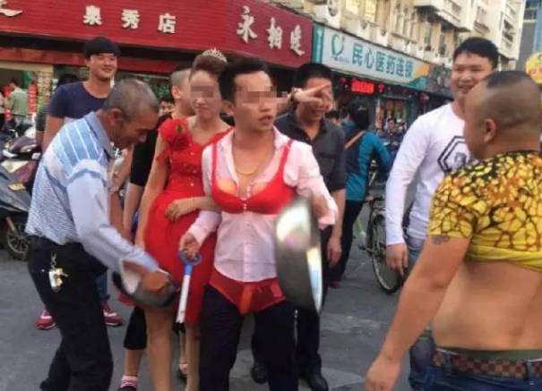 新郎被穿上女性内衣,在马路敲盆。
