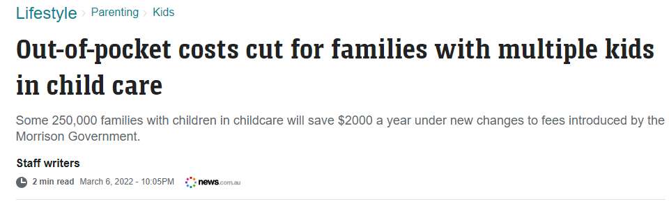 这意味着,约25万个使用托儿服务的多孩家庭每年将节省超过2000澳元!