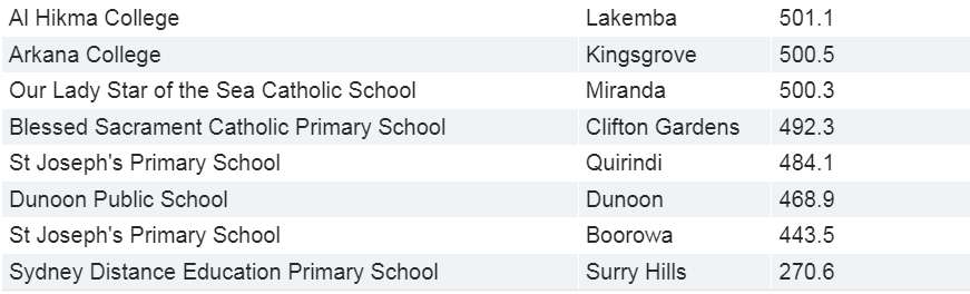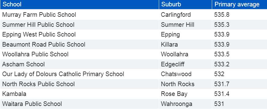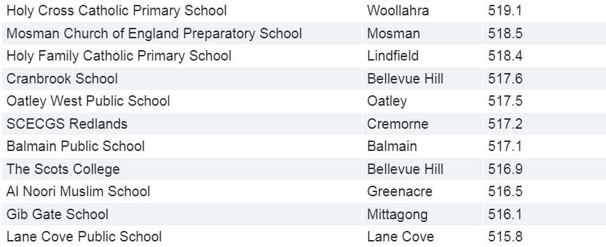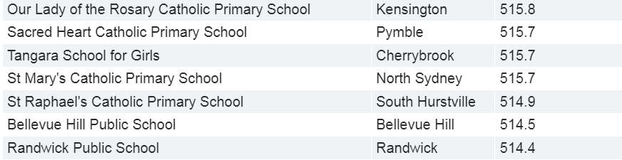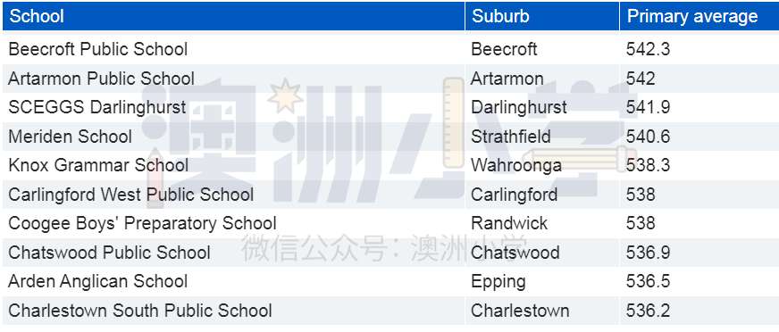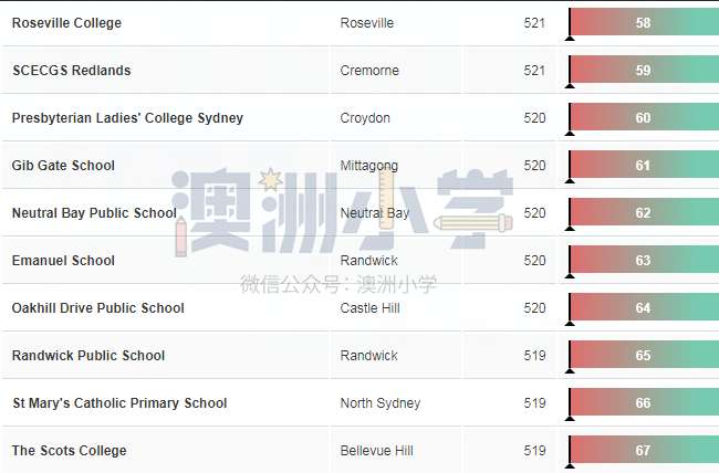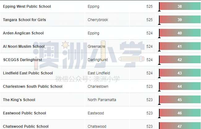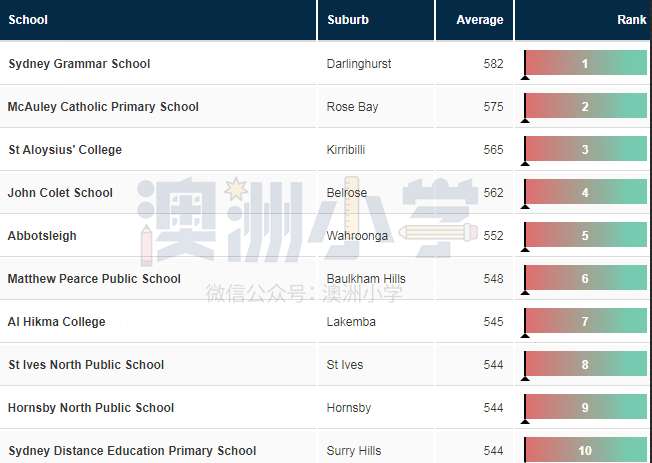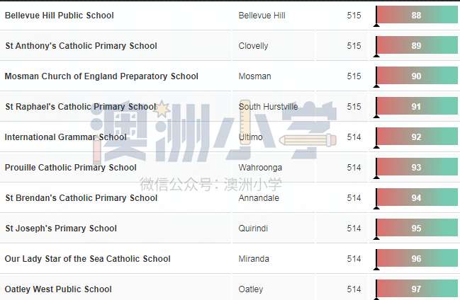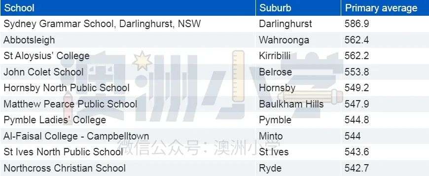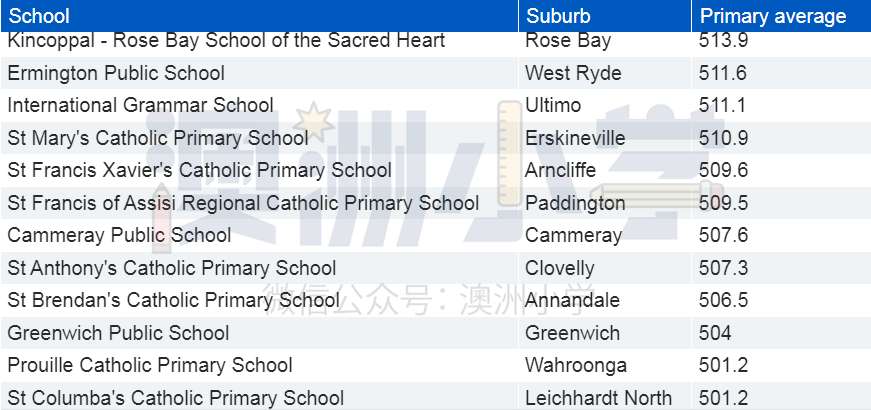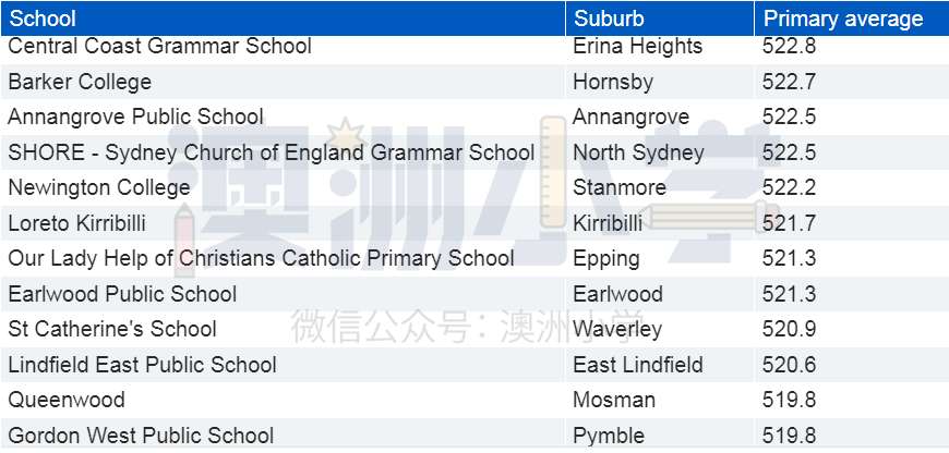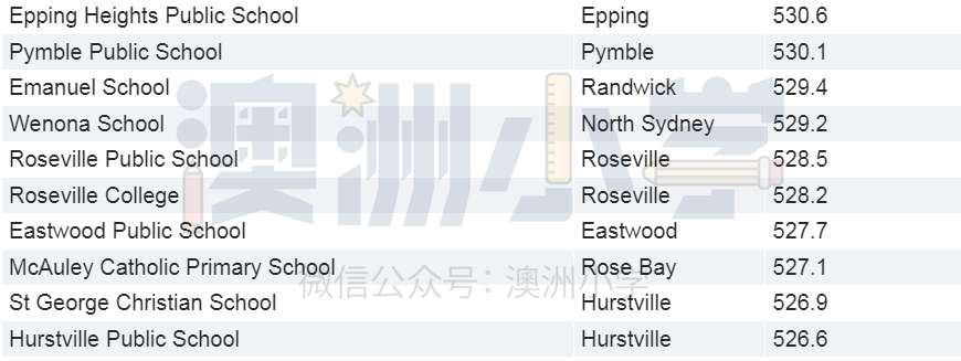 根据2021年NAPLAN考试成绩数据,列出了新州表现最好的小学(注意,该排名根据小学3年级、5年级平均分数进行排名的),如下所示: