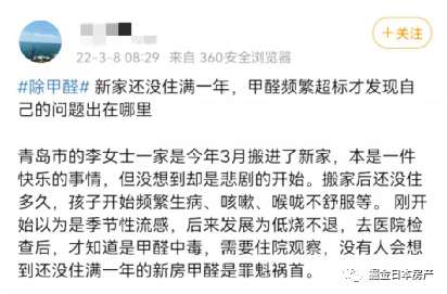 而青岛的李女士一家更是烦心。在今年3月搬进新家后,李女士的孩子开始频繁出现咳嗽、喉咙不适等症状,去了医院检查才知道,竟是因为“甲醛中毒”。