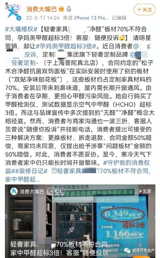 今年2月,某著名轻奢家具品牌就被曝出,旗下打着“净醛”噱头的板材,甲醛含量竟超标3倍!在消费者多次投诉之下,商家的态度竟然还十分恶劣,至今仍未达成合理的赔偿……