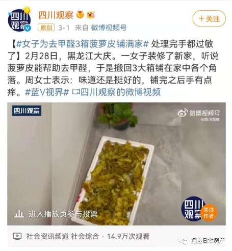 近日,黑龙江就有一名女子,为了早日入住装修好的新家,竟使出了“用菠萝皮去除甲醛”的奇葩招数,将家中的各个角落都铺满了菠萝皮。