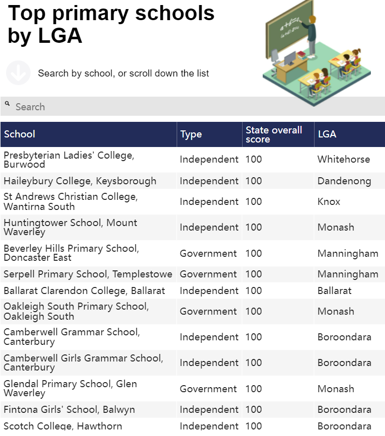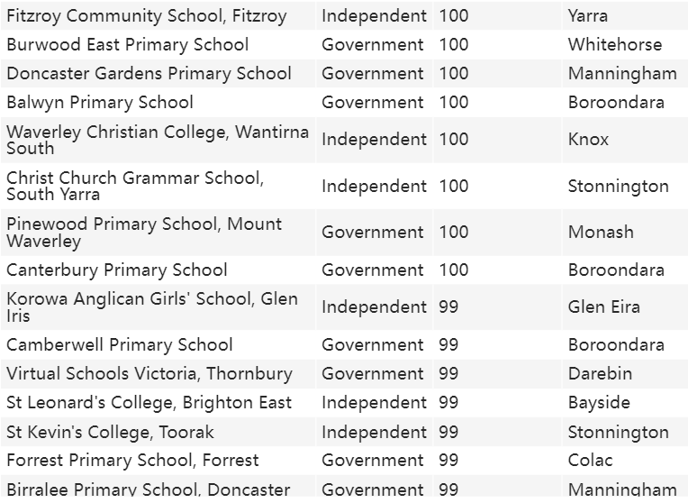 在Boroondara,则是收费高的私校表现优异,Camberwell Grammar School、Camberwell Girls Grammar School、Fintona Girls’ School和Scotch College的评分为100分, 此外,Trinity Grammar School、Erasmus Primary School和Carey Baptist Grammar School获得了99分。