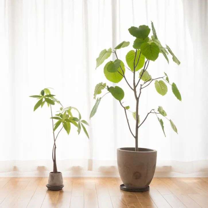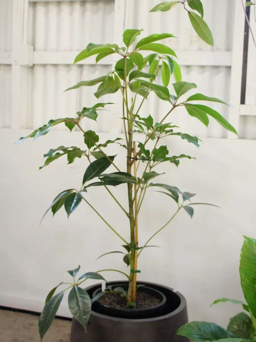 大叶伞对光线的要求不高,很适合放在客厅偏暗的角落。要定期帮它修剪枝叶,因为它会一直长大,控制在两米高会比较好看。