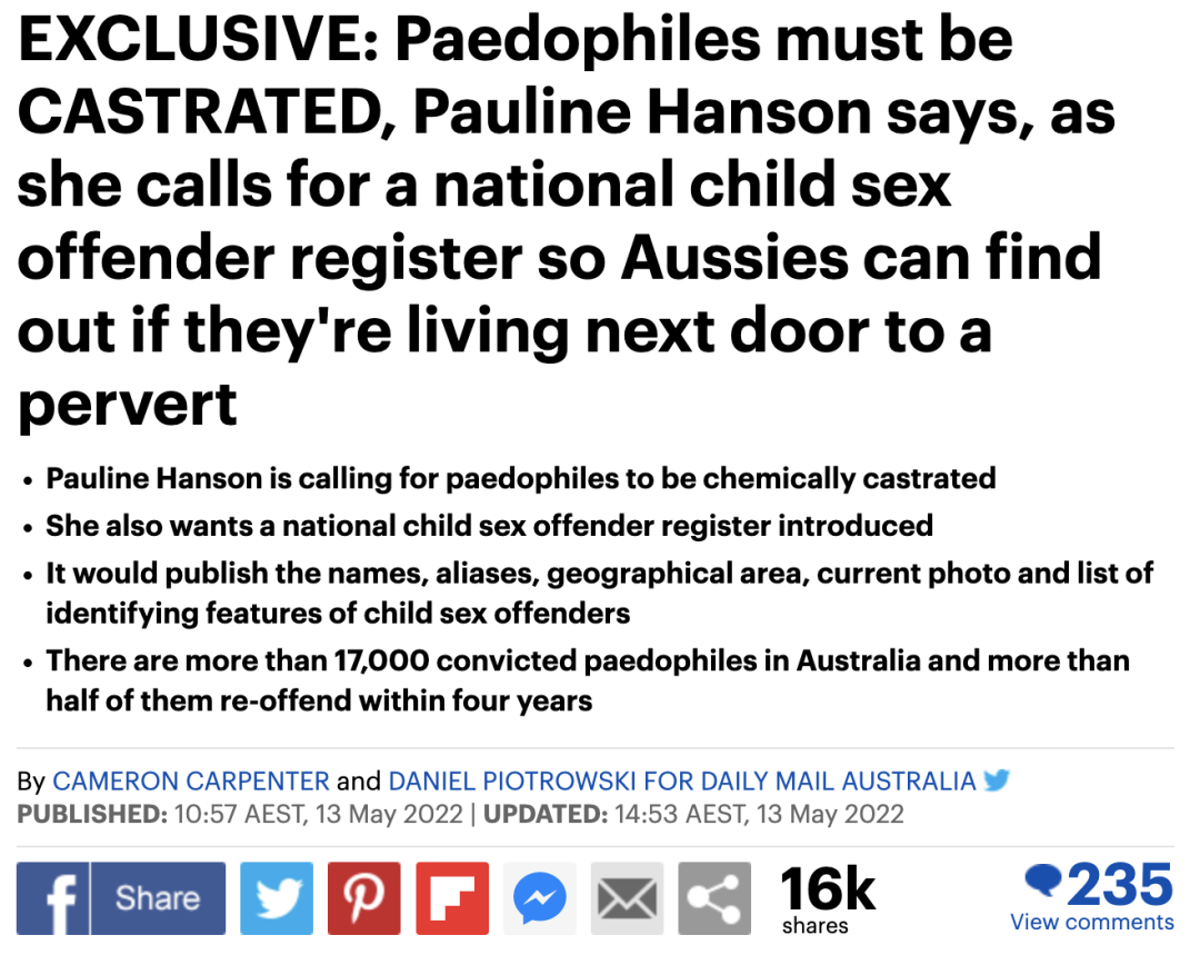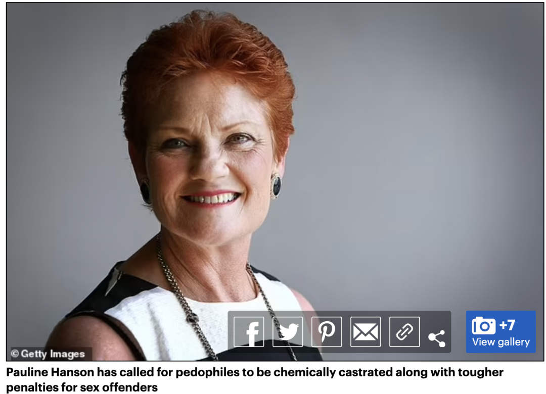 虽然澳洲大选已经成埃落定,但不少妈妈们却时刻关注着由一国党党魁韩森所推出的提案——对恋童癖者进行化学阉割,并对性犯罪者进行更严厉的处罚。