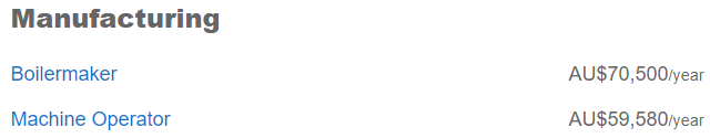 这里提到的几个行业相对都比较冷门,最低的是机器操作员$5.96万,最高的锅炉制造则约为$7万。