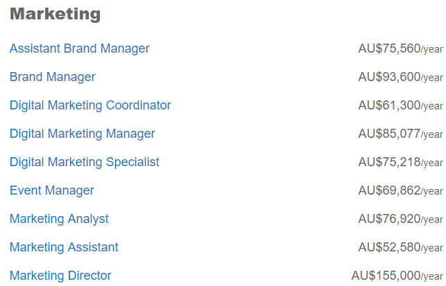 相信澳洲华人有不少都是从事这个行业,其中营销助理平均年薪$5.26万,营销总监则能拿到$15.5万。