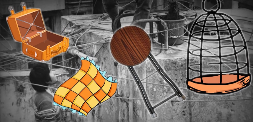 包括一个皮箱、一张床单、一把折凳和一个鸟笼。