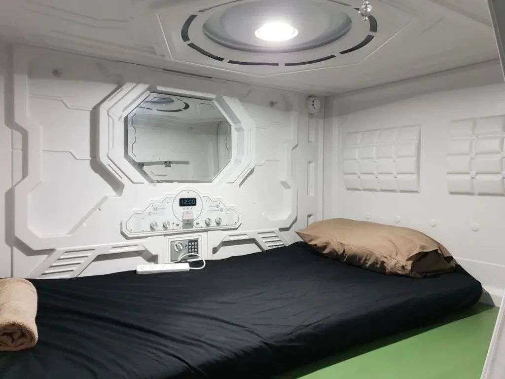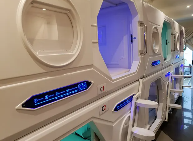 太空舱特色包括“配有自己的镜子、通风风扇、USB埠、数字控制面板、可调节的彩色阅读灯、安全柜、衣架和窗帘门以保护隐私”。共享设施包括现代厨房,电视休息区,庭院,后院花园,客用投币洗衣和烘干机。