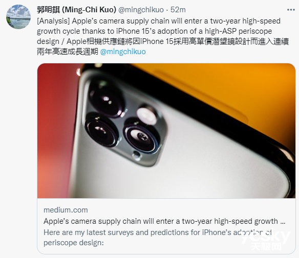 郭明錤表示iPhone 14系列的拍照升级比较常规,只有iPhone14 Pro系列才会用上4800万像素摄像头。同时,郭明錤也表示LG Innotek、高伟电子将成为苹果潜望式长焦镜头的主要供应链厂商。