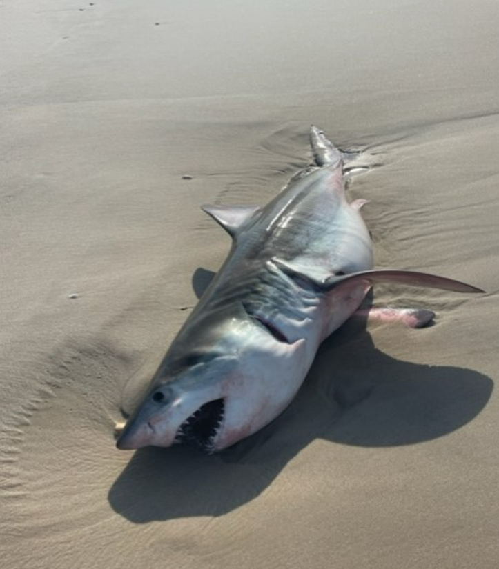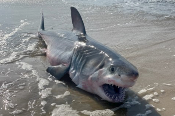 在警方分享的一张照片中,这条鲨鱼在沙滩上一动不动,锋利的牙齿暴露在外,嘴巴周围似乎有血。