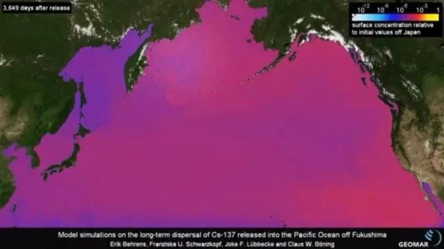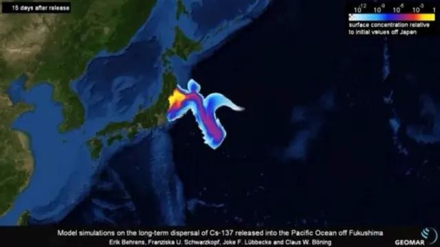如果受污染的核污水直接排放到大海里,那么这些污染物在排放后的第15天会是这样: