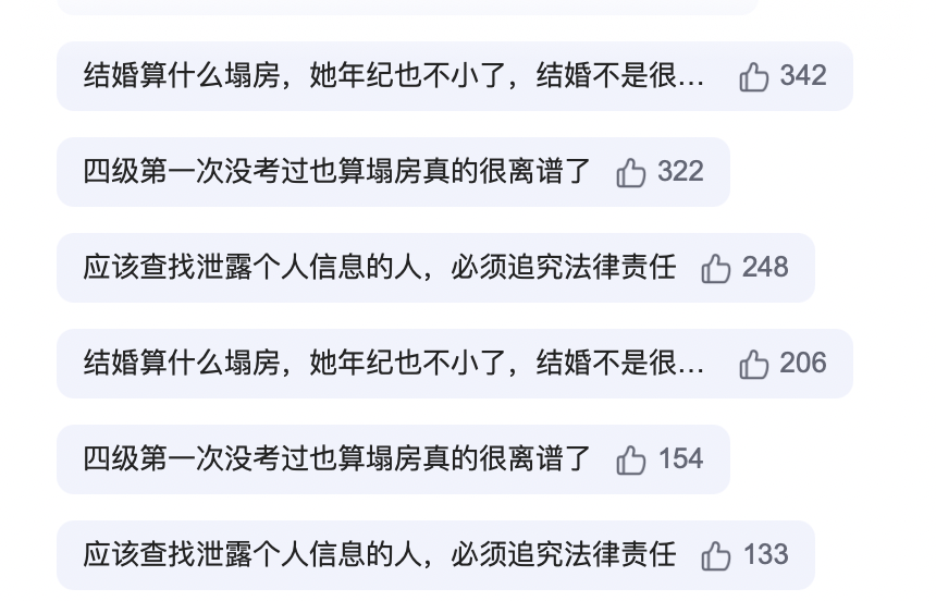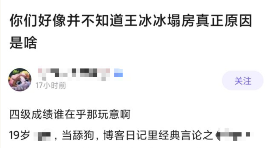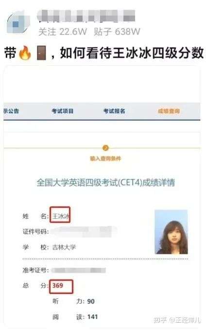 这位网友爆出王冰冰没有一次考过四级,第一次考试仅为369,以此来嘲讽她的学霸人设和业务能力;