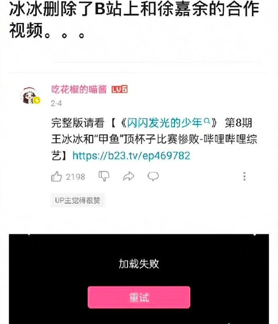但王冰冰的B站个人账号“吃花椒的喵酱”中,已经悄悄地删除了与徐嘉余合作拍摄的视频《闪闪发光的少年》第8期节目。