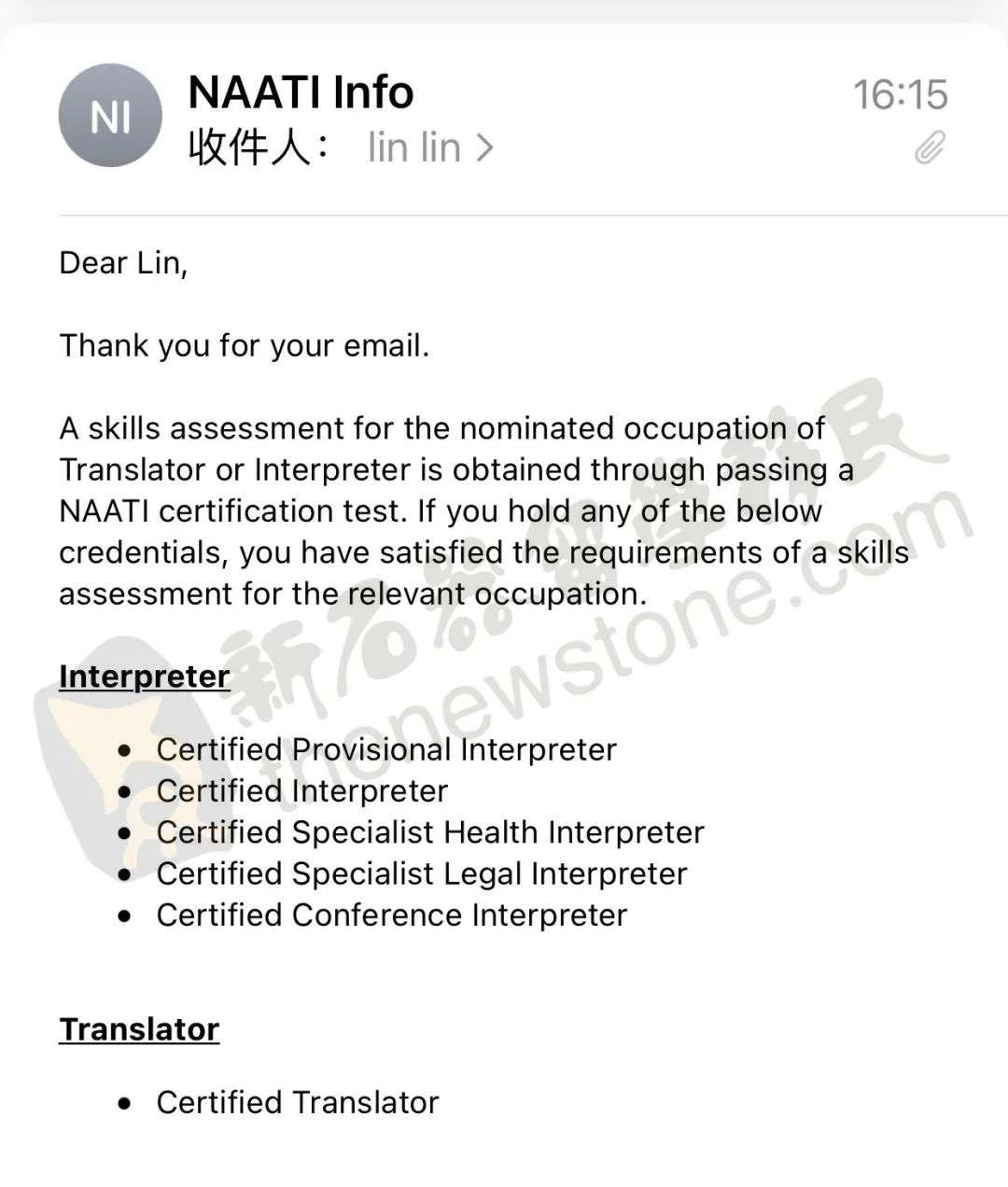 NAATI发来通知,如果申请人通过NAATI的证书考试,就有机会拿到口译或者笔译的职业评估。