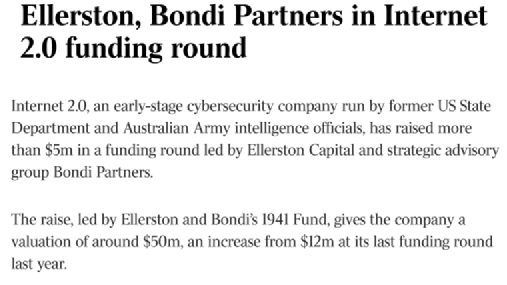 于是,根据《澳大利亚人报》和《澳大利亚金融评论报》的报道,波特和他的“因特网2.0”近日便在一个与澳大利亚和美国情报安全部门关系紧密的“私募基金”的牵头下,在新一轮融资中获得了5000万澳元的估值,并获得了超过500万澳元的融资——而去年该“公司”进行融资时获得的估值仅为1200万澳元。
