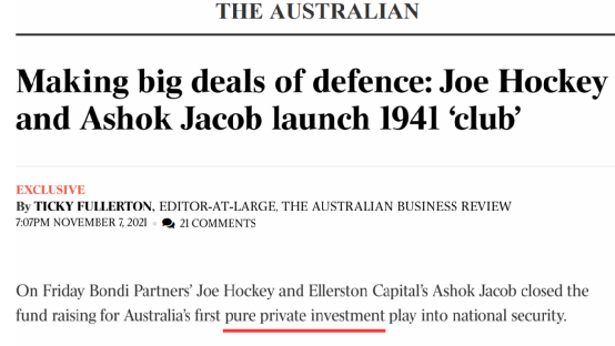 因此,虽然在去年“1941基金”成立之时,报道此事的澳大利亚媒体很想淡化这个基金的官方色彩,称其是澳大利亚首个参与国家安全领域的“纯私募投资”,可上述耿直哥提到的这些浓烈的官方色彩却很难被“洗掉”。