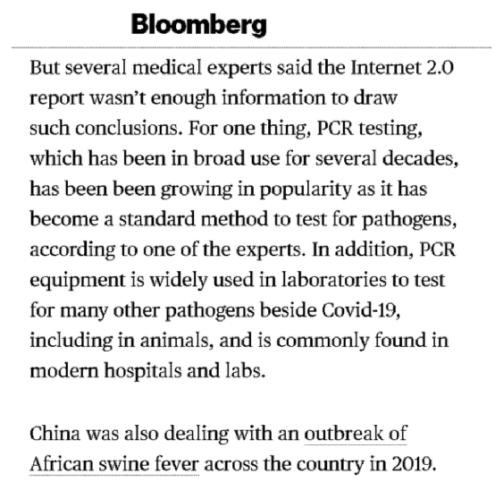 结果,就连当时报道“因特网2.0”这份报告的美国彭博社,都不得不在报道中指出这份报告的问题,比如PCR仪器的用途其实很广泛、也很常见,仅凭采购量的增加得不出什么结论。