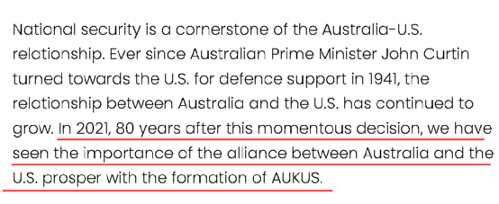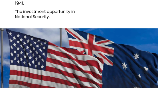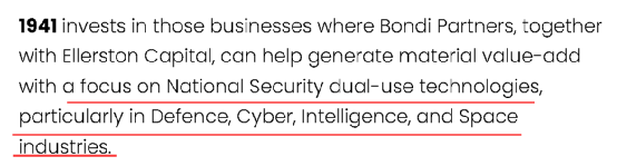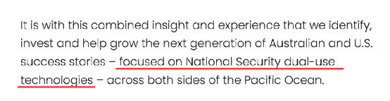 不仅如此,该基金之所以得名“1941”,恰恰是因为1941年是澳大利亚和美国正式结为军事联盟的元年。同时,该基金主要投资的“国家安全领域”,也是围绕着美英澳三国政府建立起的AUKUS“三边安全联盟”展开的。所以,该基金的官网上不仅打出了澳美两国的大国旗,明确提到了AUKUS“三边安全联盟”,其创始机构的两名负责人——即霍奇和雅克布——更毫不避讳地表示该基金的关注重点就是“国家安全领域的军民两用技术,尤其是国防、情报和太空产业。