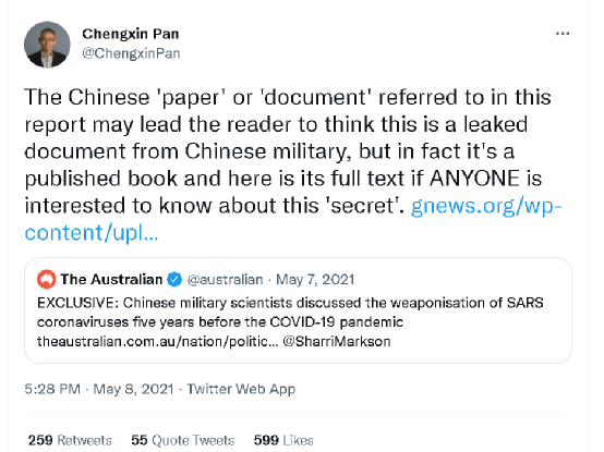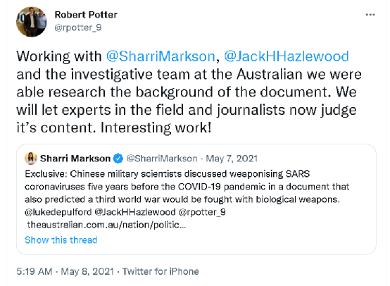 首先,在2021年5月前后,波特曾配合澳大利亚反华的默多克新闻集团在新冠病毒的来源上造谣污蔑中国。当时,默多克旗下的《澳大利亚人报》为了将新冠病毒说成是中国的“生物武器”,居然将中国网络上流传的一本怀疑2003年的非典病毒是“美国的生化武器”的书籍《非典非自然起源和人制人新种病毒基因武器》,硬说成是中国军方“泄露的文件”,然后宣称这份所谓的“机密文件”证明了中国在进行将冠状病毒“武器化”的研究。而波特当时则动用“因特网2.0”的“专业力量”,为《澳大利亚人报》“验证”了这份“泄露”文件的“真实性”。