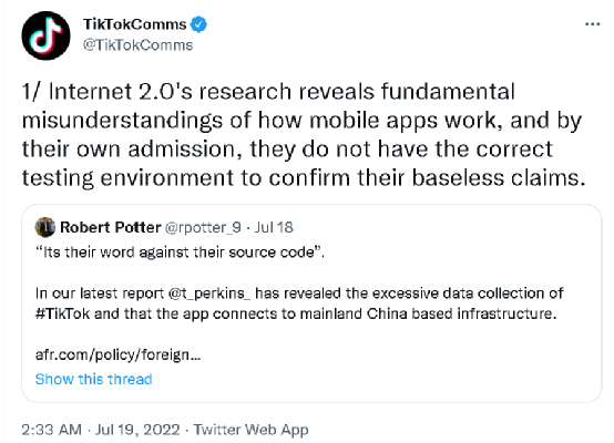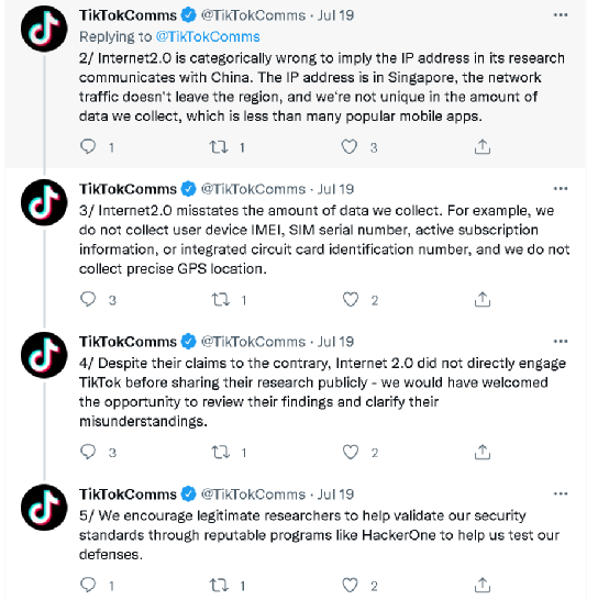 然而,TikTok方面当时就直接在网上回击了这些指控,而且是直接回应在了波特自己的社交账号上。根据TikTok的说法,波特和他的“因特网2.0”连TikTok是怎么运作的都没搞懂,搞错了TikTok的IP地址信息,夸大了TikTok收集的数据范畴,也没有就这些指控与TikTok有过任何沟通和接触,其对TikTok的指控是完全没有根据的。