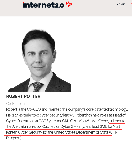 先简单给大家介绍一下这个“因特网2.0”的大致情况吧。该“公司”由曾经在澳大利亚的网络情报安全部门工作、并与美国的国务院有合作关系的澳大利亚“80后”男子罗伯特·波特(Robert Potter),以及澳大利亚军方的前情报人员大卫·罗宾逊(David Robinson)在2019年成立。