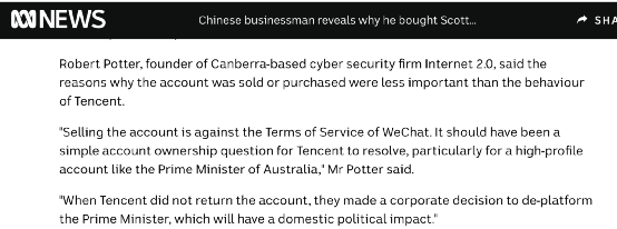 这第三个事呢,是今年年初澳大利亚大选前夕,澳大利亚时任总理斯科特·莫里森通过政府炒作他的微信账号被腾讯“封杀”的事情。