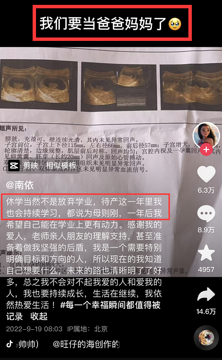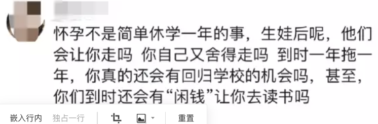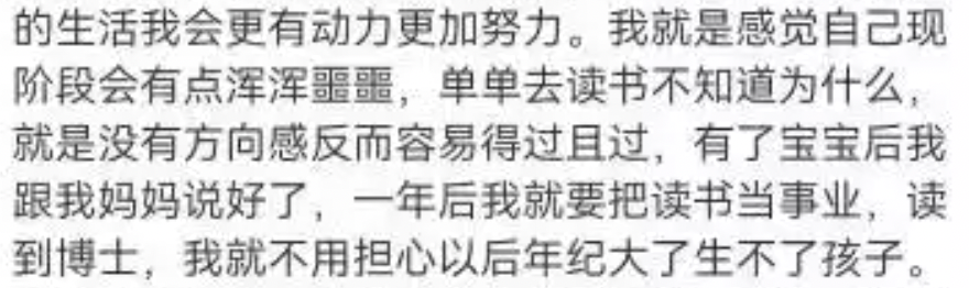 南依也表示,自己义无反顾暂停学业,是因为担心男友被别人抢走,而自己如果不生下这个孩子两人可能会面临分手。