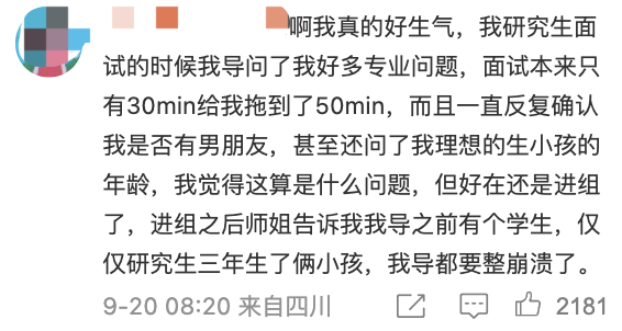 这种忧虑似乎并不是空穴来风,已经有人现身说法道,自己在研究生面试时,就因为是女性的身份被导师花了更多的时间考察。
