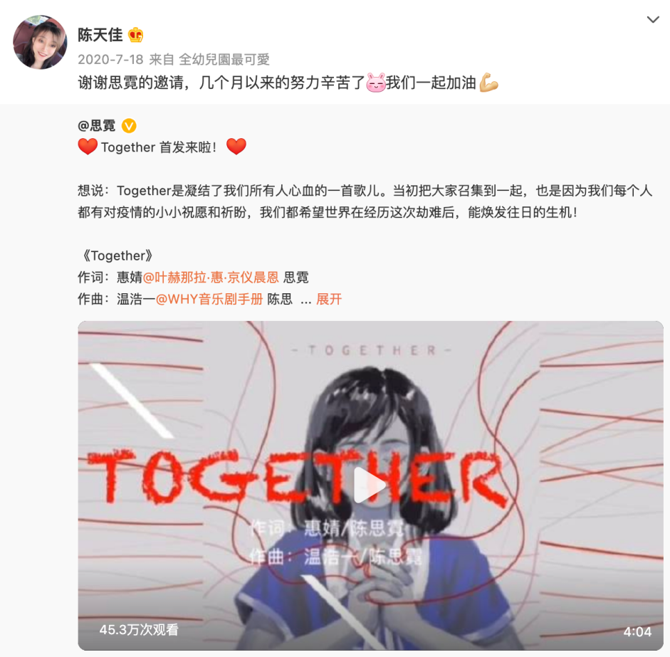 疫情期间,为大家鼓劲,她还参与了公益歌曲《在一起》的录制。