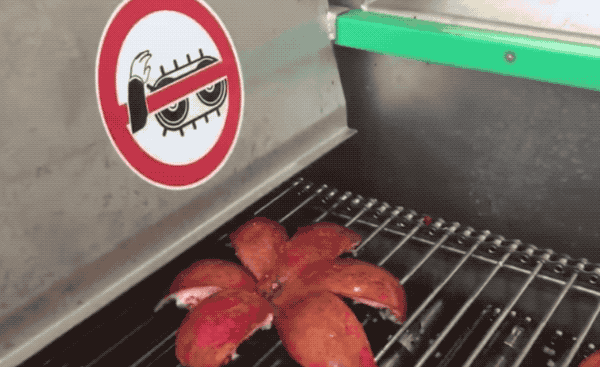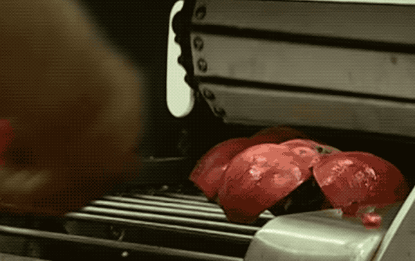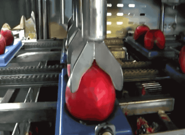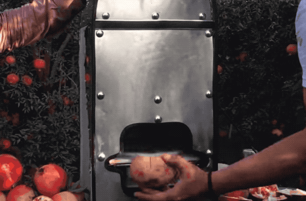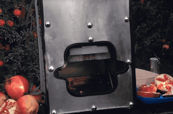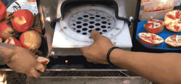 还有自动化再高一点的石榴榨汁机,能自动把石榴切成两半并放好。
