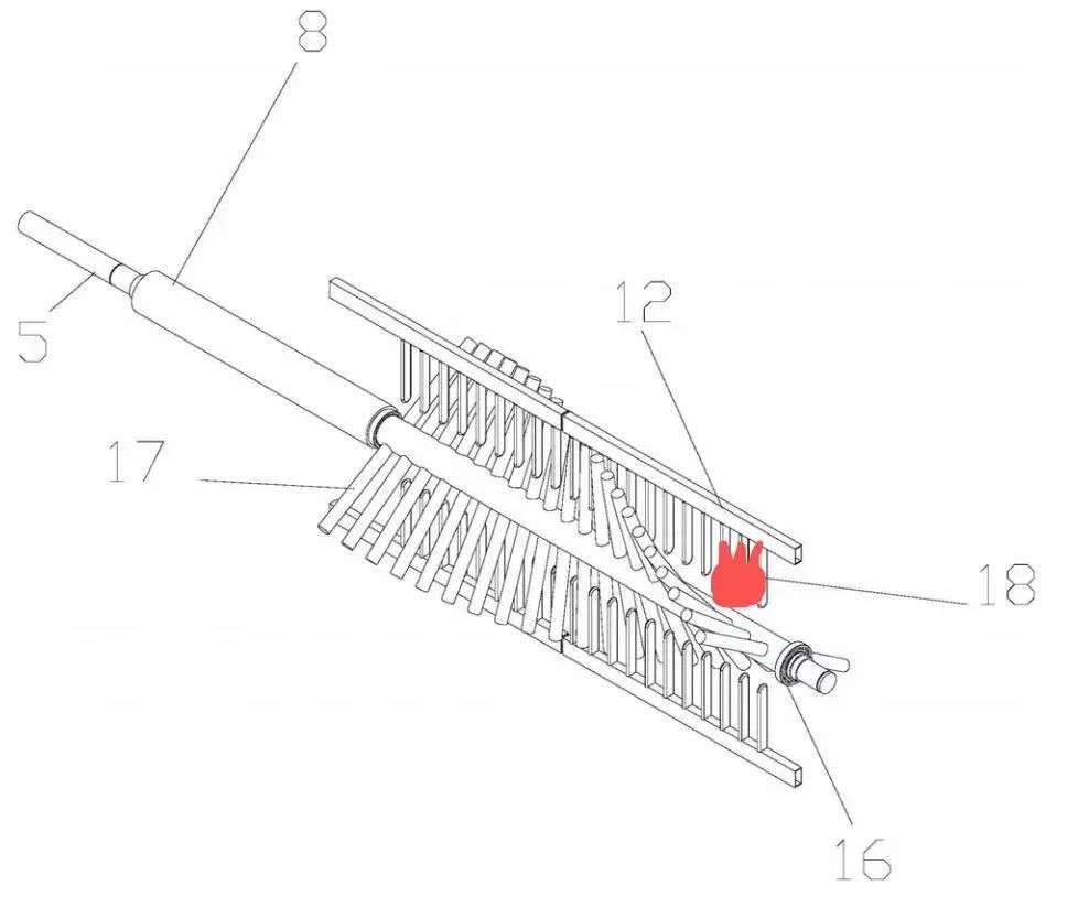 它还得配合着下图中螺旋圆棒 17 和 梳齿 18 的反向旋转,会对我画出来的红色那个石榴产生一个剪切力,从而把这个红艳艳的石榴打碎,打得果肉分离!