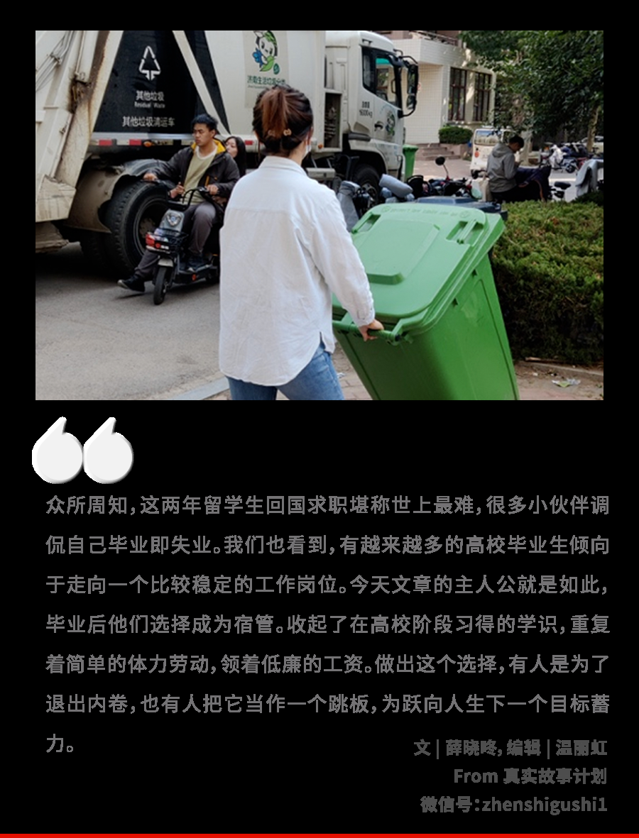 这是纯粹的体力活,值班的宿管每天都得完成。除了学会屏气以防垃圾产生的刺激性气味侵扰,她还要面对周围陌生同学毫不掩饰的探究目光——在许多学生的生活经验中,宿管往往是人到中老年的大人,而倪佰菏的面庞太过于年轻。偶尔遇到熟悉的同学,对方还可能会直接问她:你怎么还干这个?