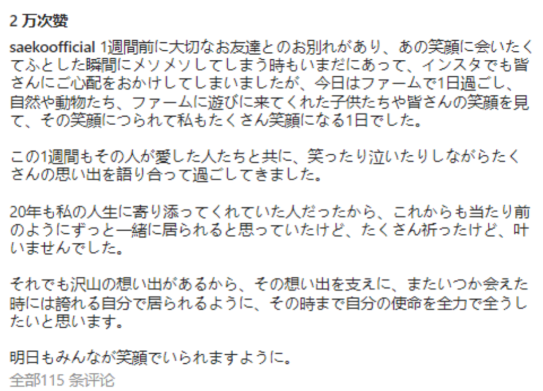 但是在YOSHI去世以后,纱荣子在Ins平台上发文,虽然没有直接提到悼念YOSHI,但是说到:本以为以后也会一直在一起,但是愿望没有实现。